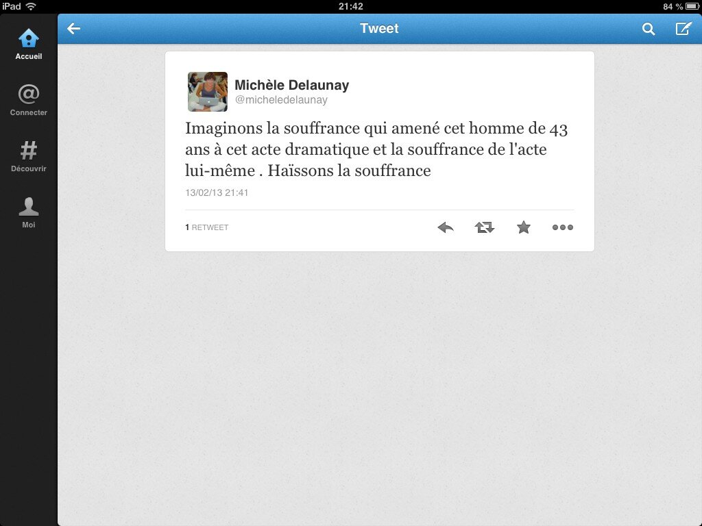 Et puis, sur ce drame du jour, j ai " adoré " le compte rendu qu en ont fait Ouest France et le Parisien: pas un mot de trop sur le bonhomme,sur le fait que c'est le chômage etc...qui se généralisent etc... , juste le témoignage du syndicat-caca qui parlent de soutien psychologique a apporter aux employés, des conditions de travail et toussa...